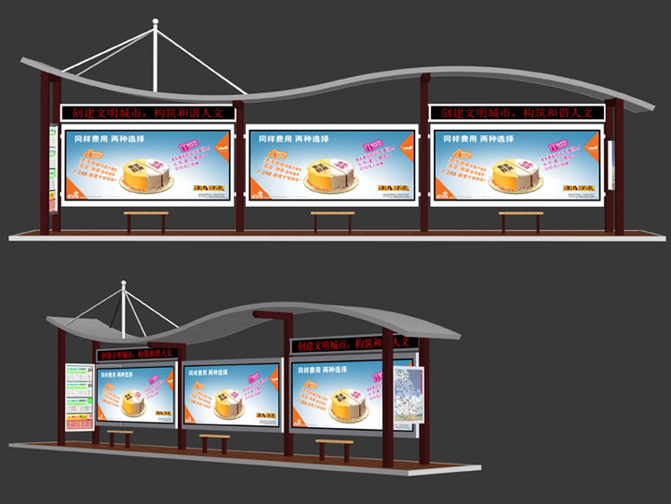 公交車候車亭一般是與公交站牌相配套的,為方便公交乘客候車時遮陽、防雨等,在車站、道路兩旁或綠化帶的港灣式公交?空旧辖ㄔO(shè)的交通設(shè)施。由于城市公交的日益發(fā)達(dá),候車亭已發(fā)展成為城市一個不可或缺的重要組成部分,設(shè)計精美的候車亭也成為了城市一道美麗的風(fēng)景。 一般候車亭棚體主要頂棚、立柱、頂弓、廣告燈箱和坐凳組成,也有用隔板來代替廣告燈箱的。