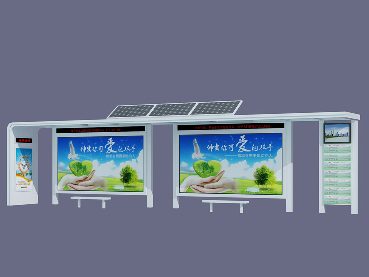 公交車候車亭一般是與公交站牌相配套的,為方便公交乘客候車時(shí)遮陽(yáng)、防雨等,在車站、道路兩旁或綠化帶的港灣式公交?空旧辖ㄔO(shè)的交通設(shè)施。由于城市公交的日益發(fā)達(dá),候車亭已發(fā)展成為城市一個(gè)不可或缺的重要組成部分,設(shè)計(jì)精美的候車亭也成為了城市一道美麗的風(fēng)景。 一般候車亭棚體主要頂棚、立柱、頂弓、廣告燈箱和坐凳組成,也有用隔板來(lái)代替廣告燈箱的。