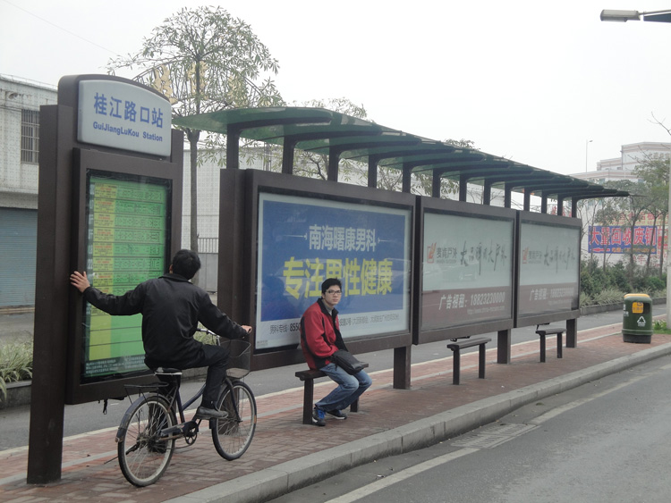 我公司專業(yè)生產(chǎn)公交站臺(tái)、候車亭、不銹鋼公交候車亭、鋁合金公交候車亭、仿古候車亭、公共自行車棚、公共自行車亭、自行車服務(wù)亭、出租車的士亭、公交電子站牌、宣傳欄燈箱、閱報(bào)欄燈箱、崗?fù)、指路牌、路名牌燈箱、LED滾動(dòng)燈箱、廣告垃圾箱、戶外大型廣告燈箱等幾十種廣告設(shè)備。