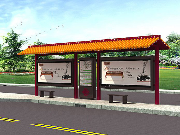 公交車候車亭一般是與公交站牌相配套的,為方便公交乘客候車時(shí)遮陽(yáng)、防雨等,在車站、道路兩旁或綠化帶的港灣式公交?空旧辖ㄔO(shè)的交通設(shè)施。由于城市公交的日益發(fā)達(dá),候車亭已發(fā)展成為城市一個(gè)不可或缺的重要組成部分,設(shè)計(jì)精美的候車亭也成為了城市一道美麗的風(fēng)景。 一般候車亭棚體主要頂棚、立柱、頂弓、廣告燈箱和坐凳組成,也有用隔板來(lái)代替廣告燈箱的。